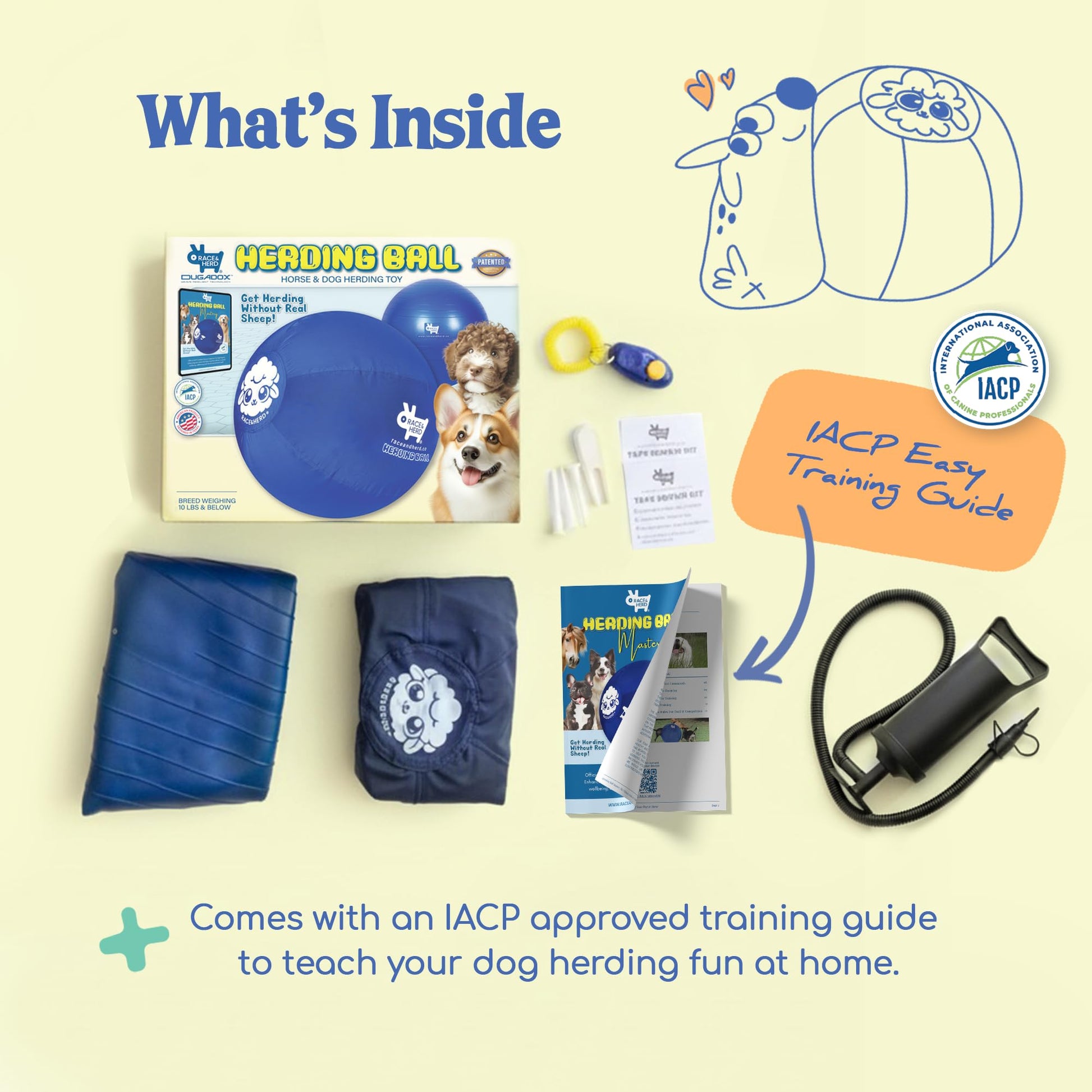 Inclusion: 25" Herding Ball, Ball Cover, Herding Ball Mastery Book, Pump, Repair Patch, Training Clicker, Ball Plug, Zipper Tool